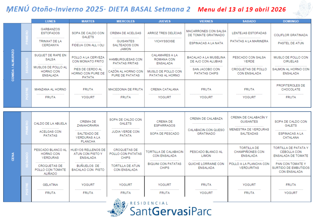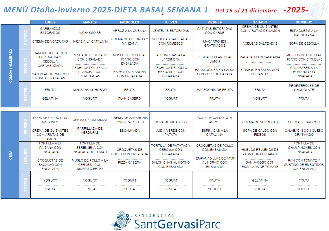 L’alimentació equilibrada i saborosa és un dels pilars fonamentals de Residencial Sant Gervasi Parc. Cada dia oferim menús variats i els nostres residents poden escollir entre dues opcions, segons el que els vingui de gust. En aquest apartat trobaràs els menús de cada setmana per estar sempre al dia.