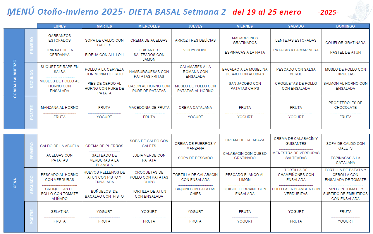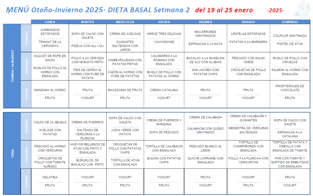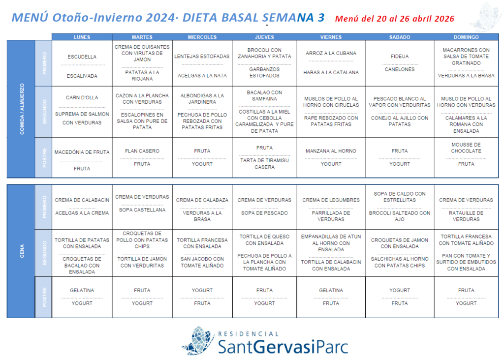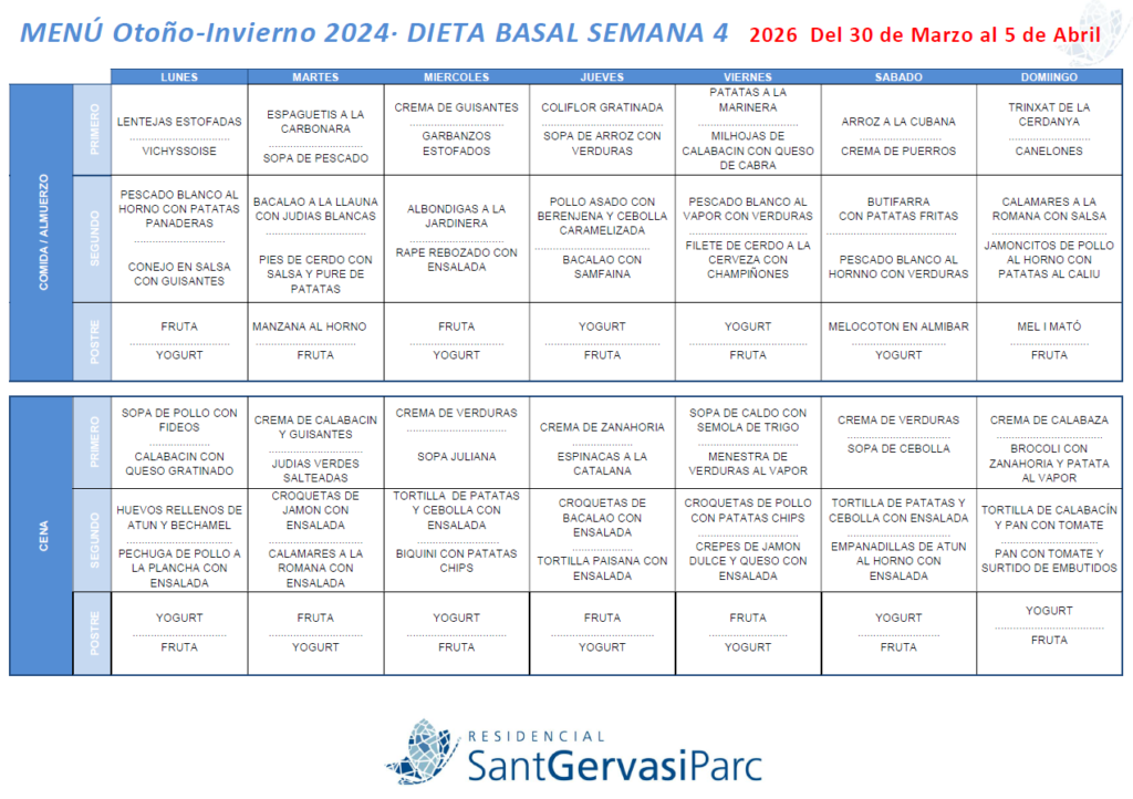 La alimentación equilibrada y sabrosa es uno de los pilares fundamentales de Residencial Sant Gervasi Parc. Cada día ofrecemos menús variados y nuestros residentes pueden elegir entre dos opciones, según les apetezca. En este apartado encontrarás los menús de cada semana para estar siempre al día.